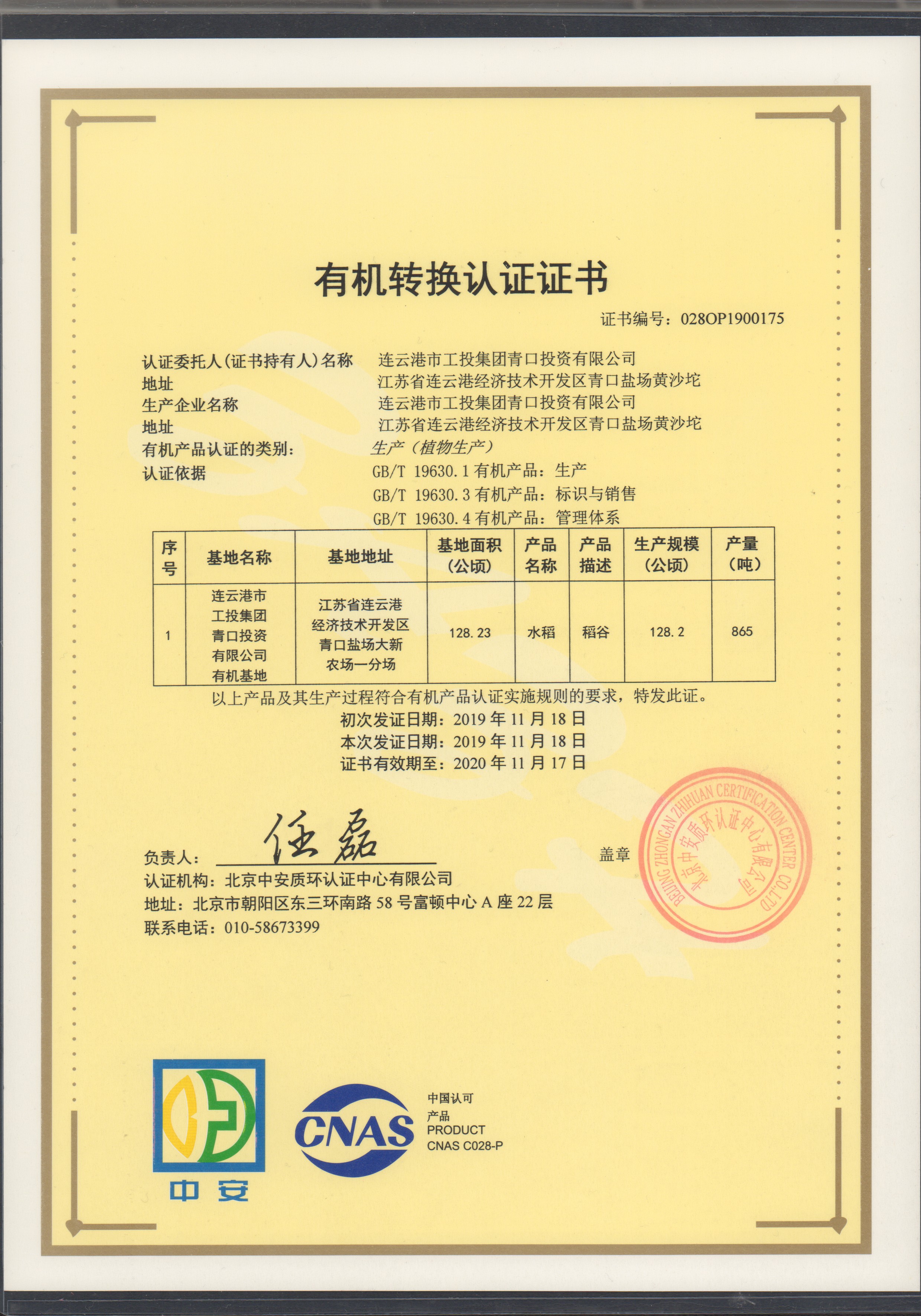 11月25日上午,青口投資公司種植的“南粳9108”有機大米經過嚴格的檢測和審核,榮獲北京中安質環認證中心頒發的有機轉換認證證書。