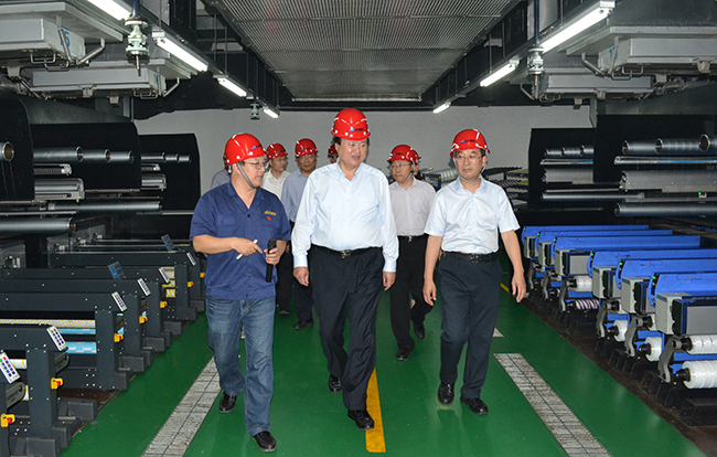 徐市長一行深入公司八期車間、立體包裝庫等一線生產區,對氨綸絲生產工藝流程以及公司生產運營情況進行了詳細了解。觀摩期間,公司總經理張斌向徐市長一行介紹了公司八期項目運行狀況、實施差別化戰略的成效以及公司中長期規劃目標。