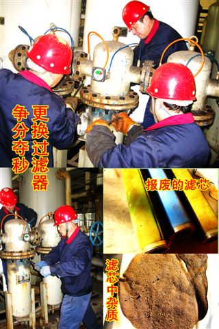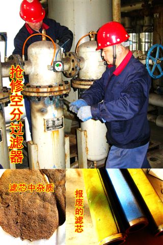 他們中間既有“技能大師”、市級“五一勞動獎章”獲得者設備“醫學專家”—伏彩兵,也有不見經傳的普通一線維修員工。近期,公用工程部人員發現1#空分制氮機組氣壓降低1個表壓,能耗上升,氮氣純度和產氣量雙降,有報警停車隱患,經維修和自主維修“醫生”緊急會診,診斷為“芯梗”,需要立即“換芯”(更換空氣過濾器濾芯),面對突發情況,為保證生產安全運行,維修人員自覺加快維修進度,加班加點開展濾筒解體,吊裝,換芯,復位等工作,提前兩小時完成搶修任務,原“芯梗”制氮機組進氣運行后壓力恢復正常,隱患解除。