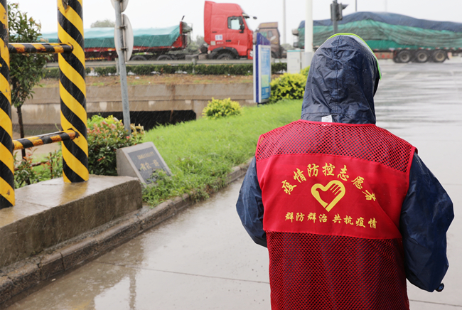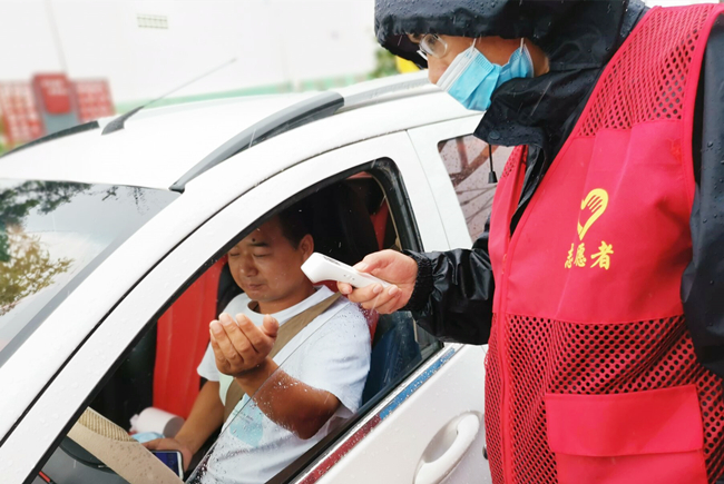 “您好,請(qǐng)出示一下行程碼,做下登記?!眻?jiān)守在崗位,逆風(fēng)迎雨,對(duì)車輛進(jìn)行逐一登記和體溫檢查,絲毫沒(méi)有受天氣的影響。
