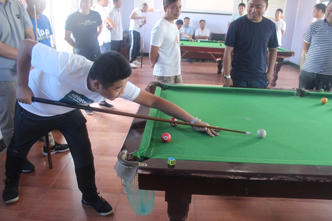 ? ? 26日的臺球比賽賽場設(shè)在三洋分場院內(nèi),賽場內(nèi)高懸大紅燈籠及條幅,為活動增添了喜慶的氣氛。