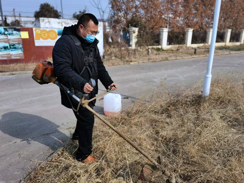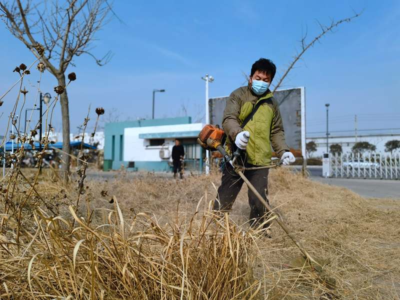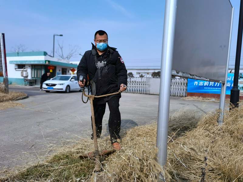 經驗老道的“除草匠人”朱春華一馬當先,一人成軍,小小雜草在揮舞的打草機下“灰飛煙滅”